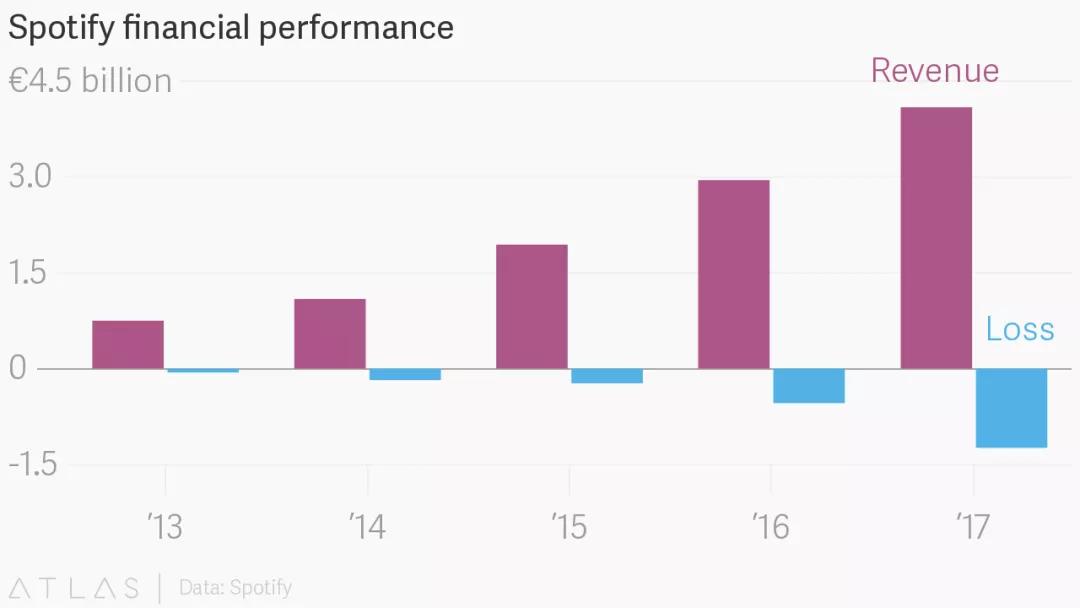 ▲ Spotify 这几年的亏损不断亏大. 图片来自:Atlas