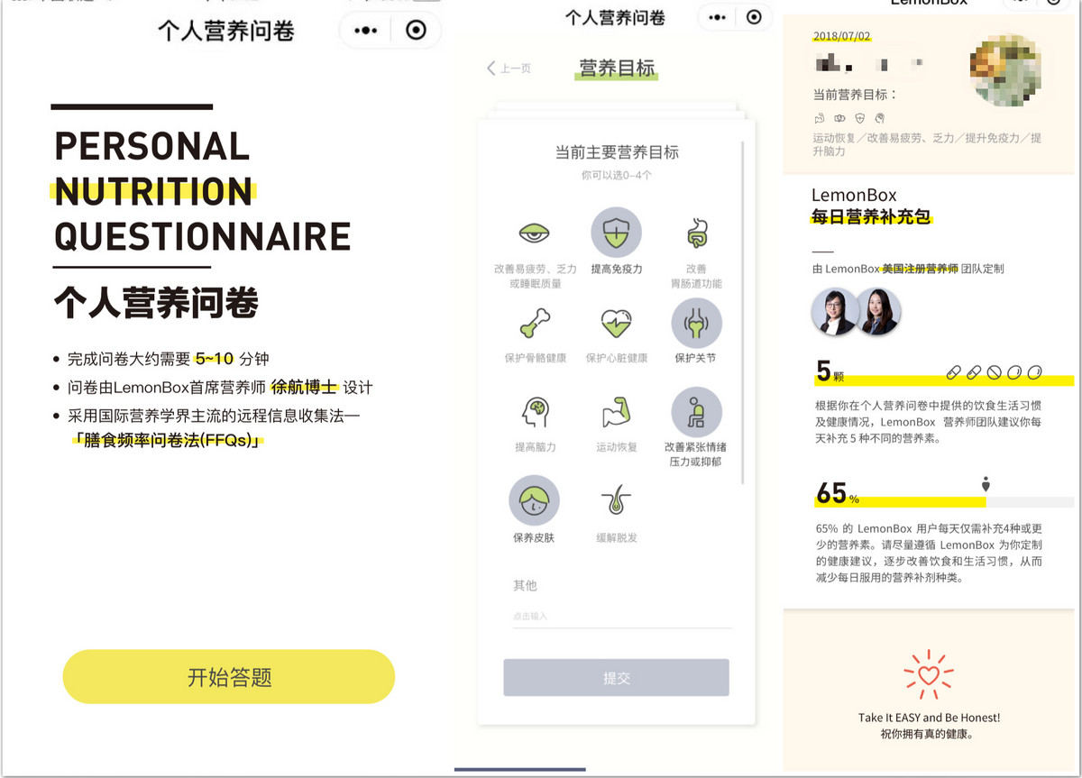 我们先来了解一下它,LemonBox 为用户提供营养解决方案——“按月定制”的每日营养补充包,目标人群是一二线和发达三四线城市的 25-35 岁白领(女性为主)。