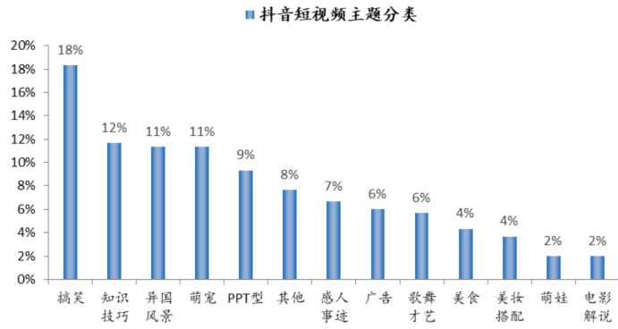 从抖音的短视频题材分布来看,搞笑仍是占比最高的细分内容,其次是知识技巧、异国风景、萌宠等,这四类合计占比达到52%。