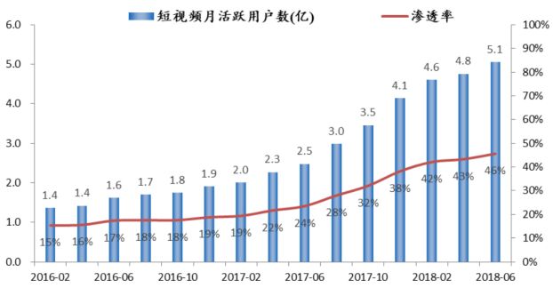 与市场规模增长相辅相成的是短视频月活用户数和渗透率的快速增长。据统计,截至2018年6月,短视频用户占全网用户的比例,即渗透率已经达到46%,月活用户数也从2016年2月的1.4亿增长至5.1亿。