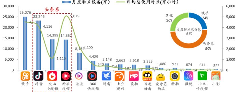 根据相关机构统计的2018年6月各平台月度独立设备数来看,快手、抖音可以说是一骑绝尘。拥有抖音、火山小视频、西瓜视频的头条系更是在下载设备数量方面占比达到50%。虽然截至6月的数据,快手仍是稳坐第一把交椅,但是抖音凭借高于快手的用户粘性和头条系强大的导流功能,很可能现在已经超过快手成为行业老大。