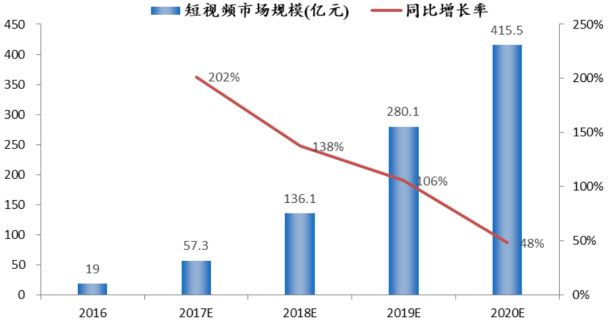 近两年,短视频行业增长迅速。2016年短视频市场总规模约19亿元,但预期到2020年,该市场规模将达到415.5亿元,年均复合增长率116%,行业规模增速远高于2015年的电影票房大爆发。