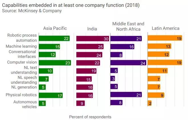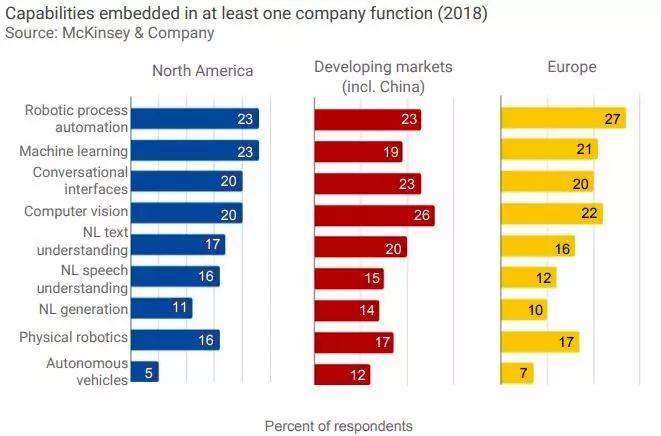 同样是麦肯锡公司对2135名受访者的调查结果。下面的图表描述了组织在特定业务功能中试验或采用AI能力的受访者的百分比。