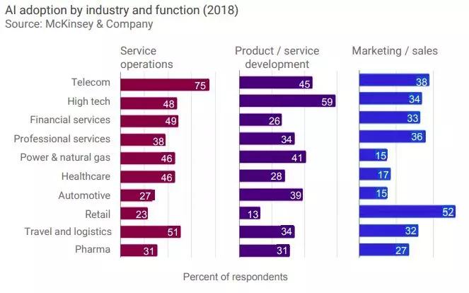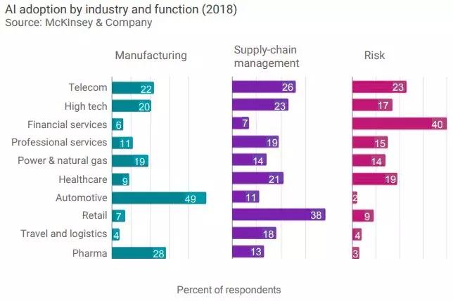 组织倾向于将AI能力纳入其行业内最有价值的功能中。例如,金融服务在很大程度上将AI与风险结合在一起,而汽车行业则将AI采用到制造中,零售业则在营销/销售方面采用AI。