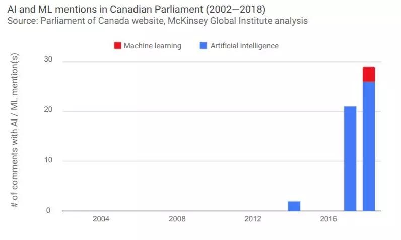 下图显示了美国、英国和加拿大的议会记录中提及“人工智能”和“机器学习”的情况。在这三个国家的议会中,对这两个词语的提及频率自2016年以来快速上升。而且,“机器学习”在2016年之前很少被提及,而且相对于“人工智能”而言,被提及的次数仍然很少。