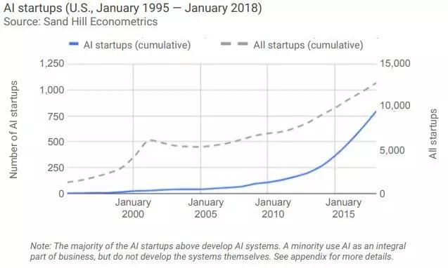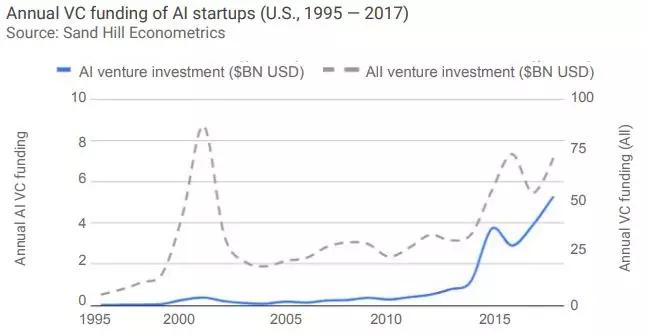 从2013年到2017年,美国AI创业公司的风险投资增加了4.5倍,而所有活跃创业公司的风险投资增加了2.08倍