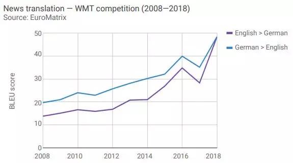 下图显示了AI在新闻英德互译中的表现。从2008年到2018年十年间,英译德机器翻译BLEU得分提高了3.5倍,德译英机翻水平则提高了2.5倍。需要指出,由于每年使用的测试集不同,得分并不是完全可比的。但整体看BLEU得分有一定参考意义。