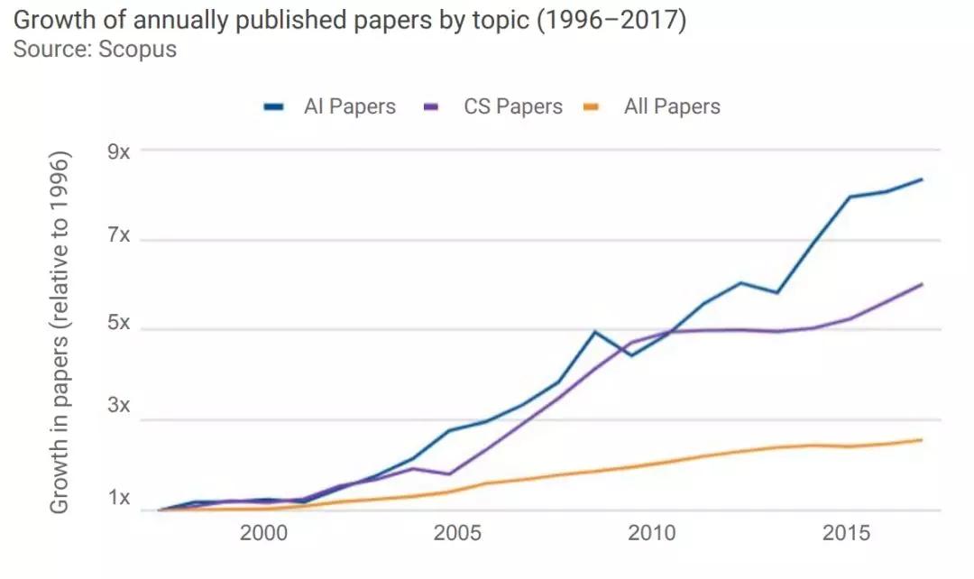 上图是相较于1996年,学术论文的年度出版率增长情况,该图比较了计算机科学(CS)领域和AI领域的论文发表率增长情况。从1996年到2017年,AI领域的论文增加了7倍(8x),CS领域的论文增加了5倍(6x)。