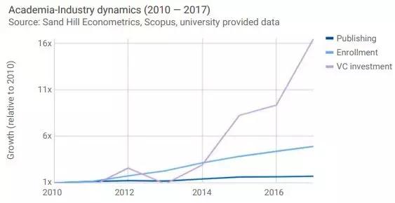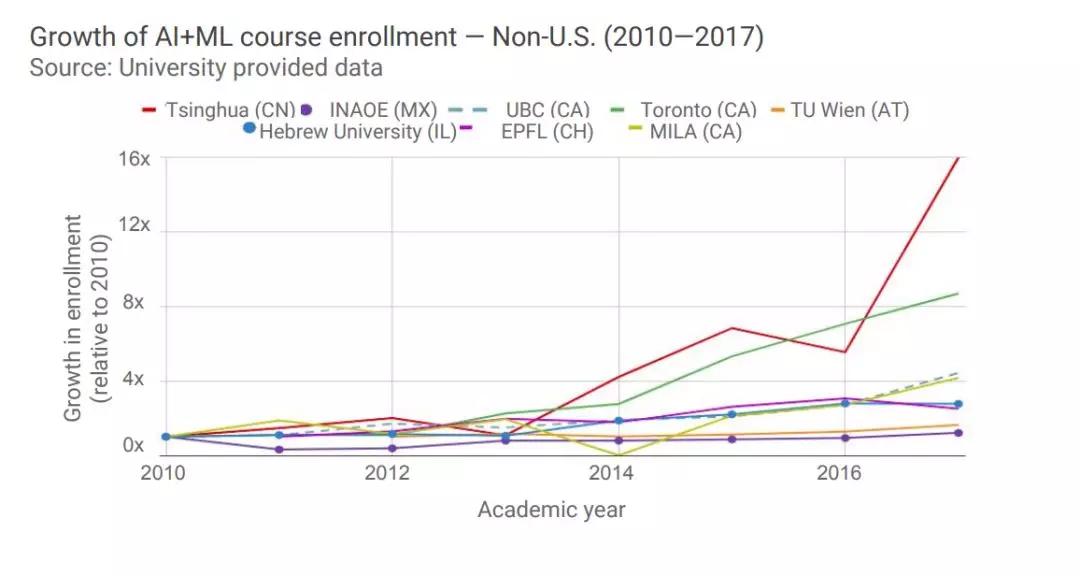 而从清华自身来看,该校2017年AI和ML课程注册人数是2010年的16倍。