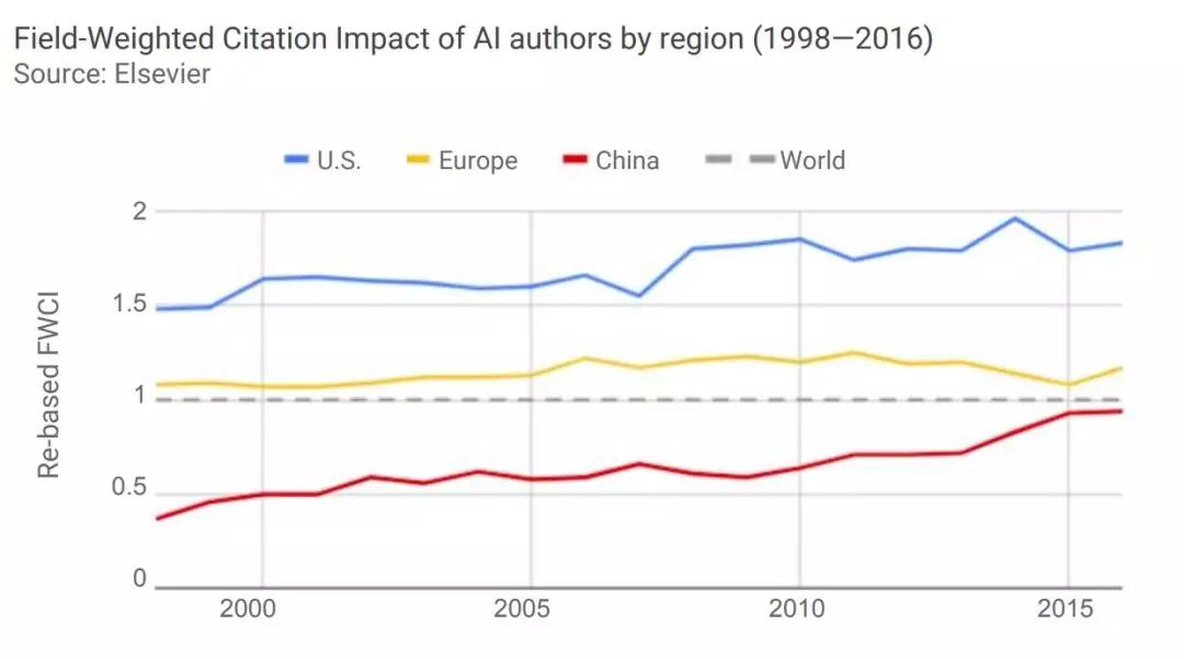 FWCI是领域权重引用影响系数,可以用来衡量论文的影响力。尽管欧洲每年发布的AI论文数量最多,但引用影响力处于世界平均水平。相比之下,2016年中国AI论文的被引用率比2000年高出了44%。美国在这方面表现突出,美国作者AI论文的引用率要比世界平均水平高83%。