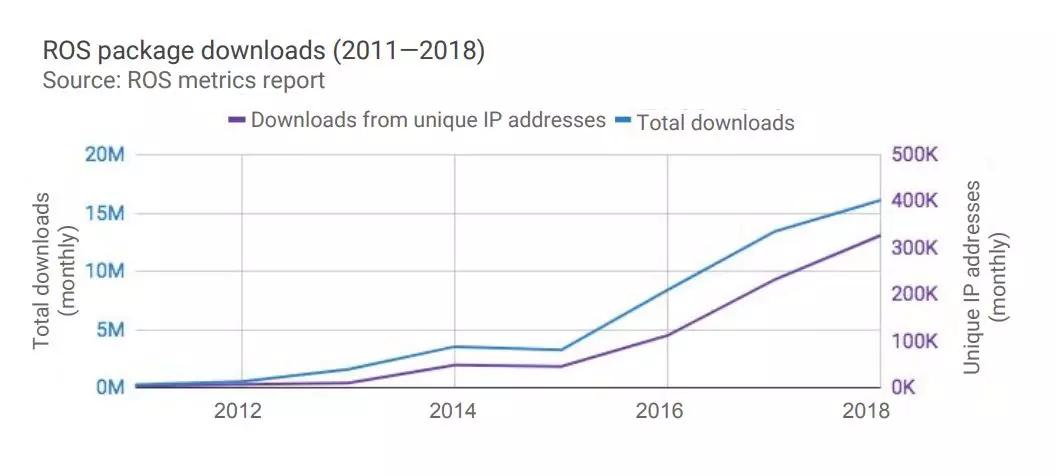 下图所示为随着时间的推移从ROS.org下载的机器人操作系统(ROS)二进制包的数量。 ROS是一种广泛使用的机器人开源软件栈,为许多制造商和学术研究人员广泛使用。 左轴为平均每月下载量,而右轴为仅来自独立IP地址的平均月下载量。 自2014年以来,总下载量和单IP下载量分别增长了352%和567%。