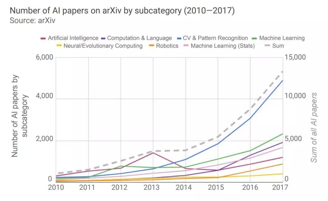 自2010年开始,arXiv上的AI论文迅猛增长,从2010年的1073篇,到2017年发布的13325篇。其中计算机视觉领域(CV) 是自2014年起增长最快的一个领域 (上图蓝线) 。