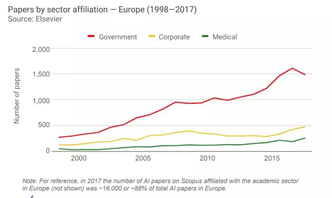 在政府主导的AI论文中,从2007年到2017年,中国增长了400%;而企业论文在这期间增长了73%。在美国,相对较大比例的AI论文来源于企业,美国企业的AI论文比例要远高于中国和欧洲。