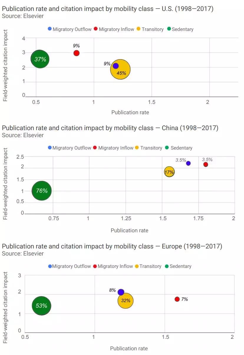 在美国、中国和欧洲这三个国家和地区中,中国低流动性(“久坐不动”)的AI作者比例最大(76%),其次是欧洲(52%),最后是美国(37%)。