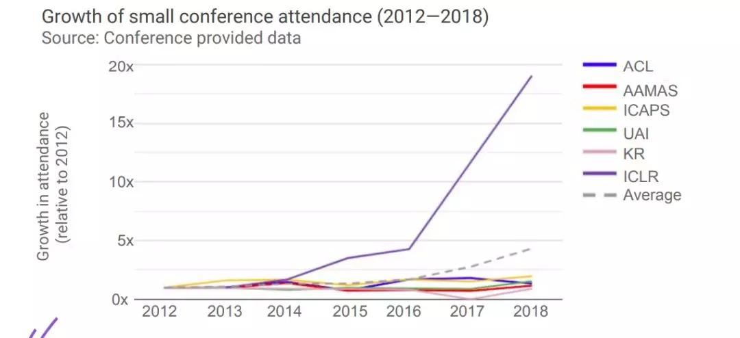 不仅是大型顶会的参会人数增长,小型会议的热度也在不断上升,其中最为突出的是ICLR,ICLR 2018的参会人数是2012年的20倍。
