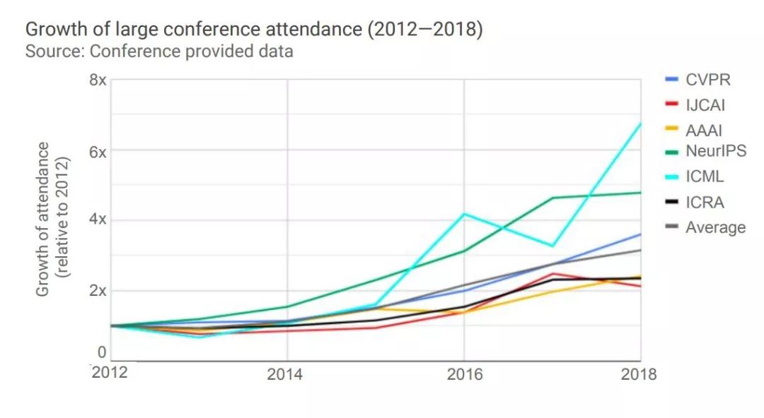 其中,NeurIPS 2018年参会人数是2012年的4.8倍,ICML则是2012年的6.8倍。