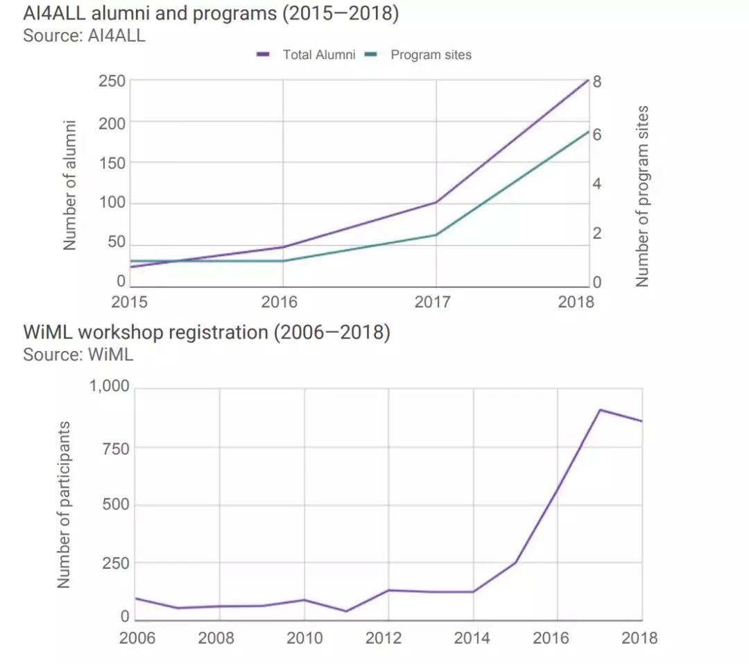 上图显示了两个研讨会的年度注册数量:其中一个是由女性参与的机器学习(WiML)主办,该组织致力于支持女性参与机器学习,以及AI4All的校友人数,后者旨在增加人工智能的多样性和包容性的教育计划。 相比于2014年,WiML研讨会2015年的参与者增加了600%,AI4ALL的校友人数增加了900%。