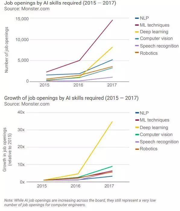 虽然ML是最大的技能要求,但深度学习(DL)的增长速度最快——从2015年到2017年,需要DL技能的职位空缺增加了35倍。