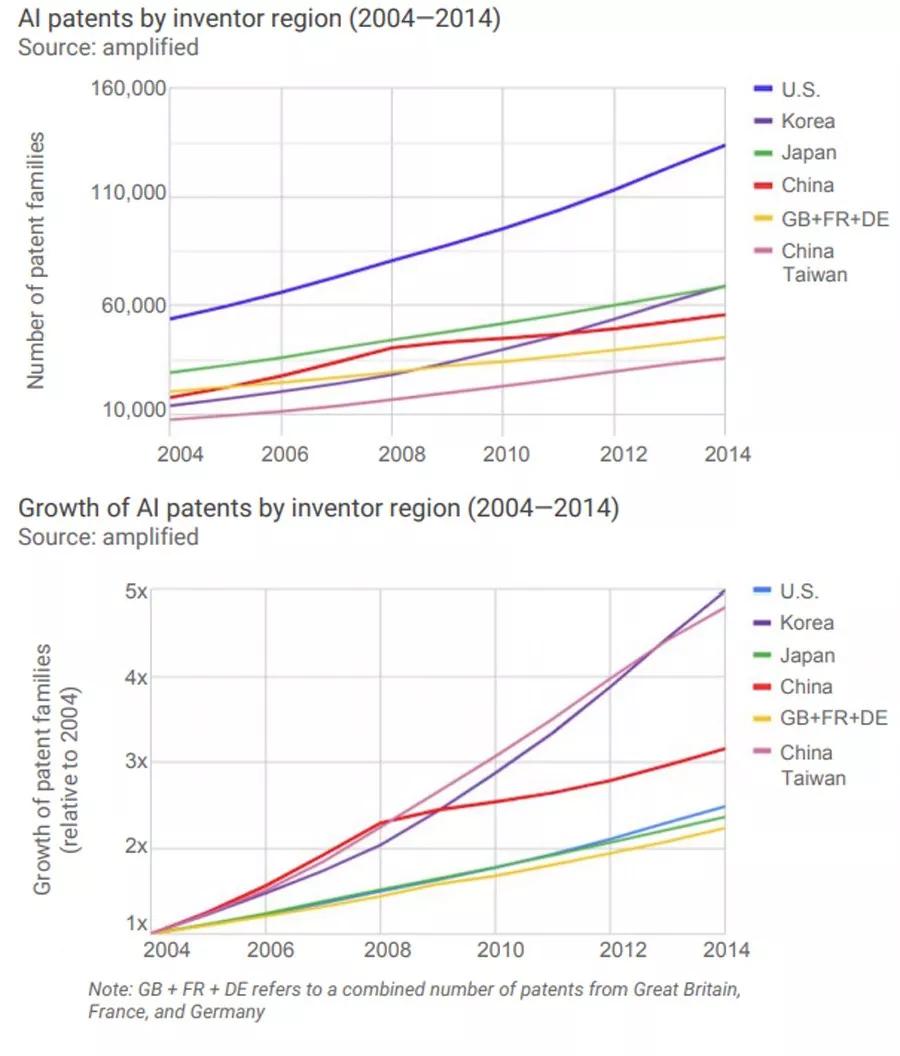 2014年,约30%的AI专利来自美国。其次是韩国和日本,这两个国家各自拥有16%的AI专利。就发明人地区来说,韩国和中国台湾增长最快,2014年AI专利数量是2004年的近5倍。