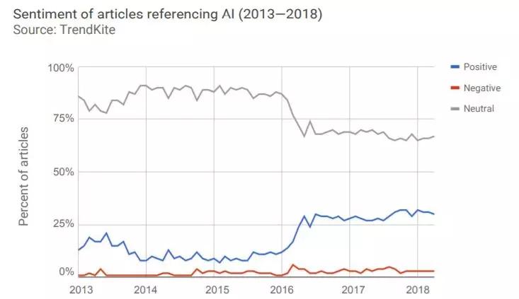 下图所示为在大众媒体的文章中包含“人工智能”一词的文章比例,这些文章被分为正面、负面或中立文章。从2016年初开始,关于人工智能的文章变得更加“正面”,其比例从2016年1月的12%上升到2016年7月的30%。从那时起,“正面”文章的比例一直在30%左右。
