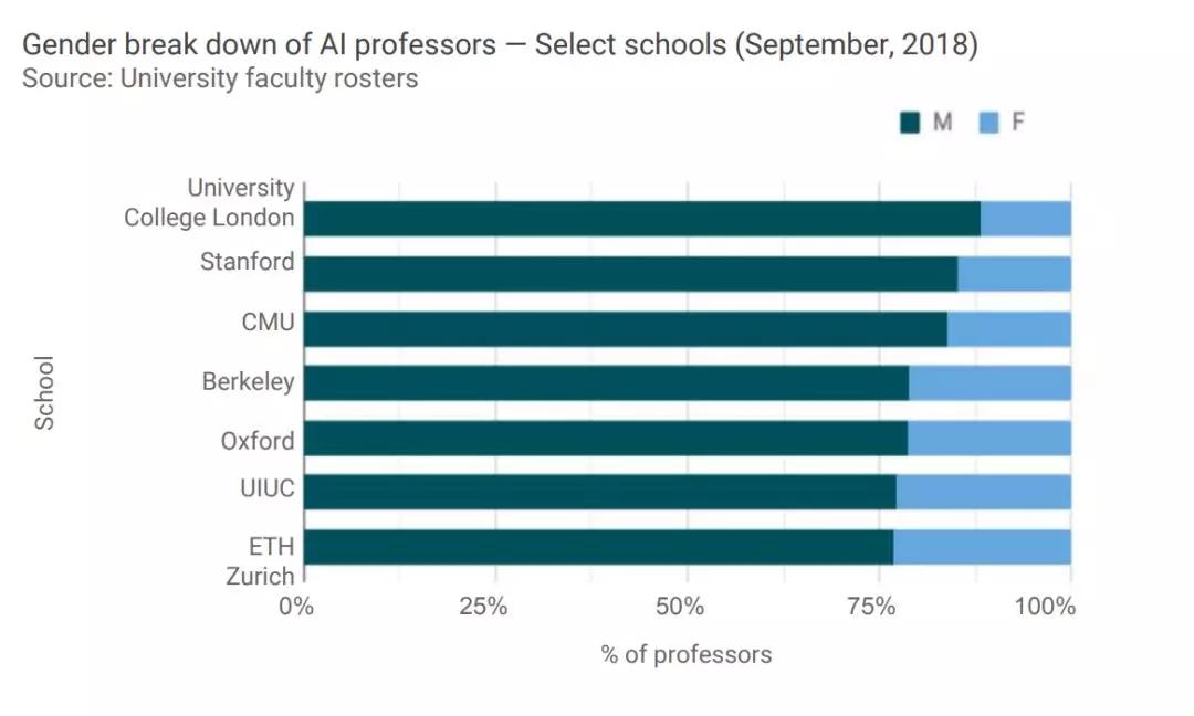 在所研究的学校中,我们发现平均80%的AI教授都是男性,在世界各地、各大高校都是如此。