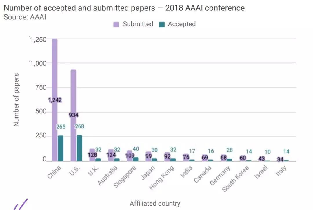 在2018-AAAI顶会上提交的论文中约有70%来自美国或中国。 中国提交的论文数量最多,但美国和中国被接受的论文数量基本相同,分别为268和265。