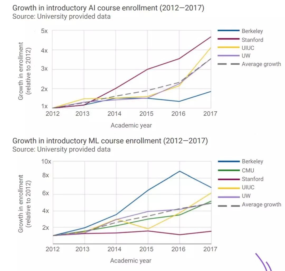 加州大学伯克利分校在这方面增长最迅速,2017年入门ML课程的学生人数是2012年的6.8倍。