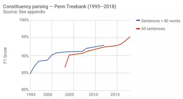 下图显示了AI系统在确定句子句法结构任务上的表现。语义分析(Parsing)是问答等特定自然语言理解任务中的第一步,如今已经几乎全部由深度学习完成。自2003年以来,句子成分语义分析水平、F1得分提高了9个百分点,或相对提高了10%。