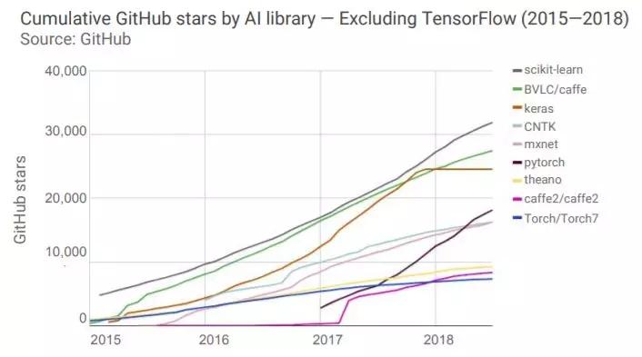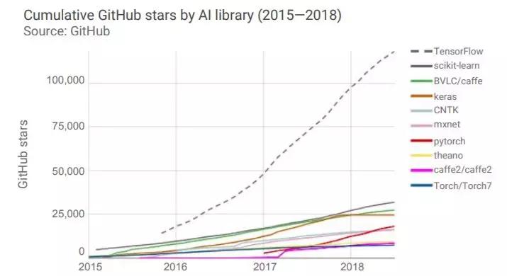 下图是Github上出现的各类AI和机器学习软件包的次数。从图中可以大致看出各类AI编程框架的受欢迎程度。最近呈现的两大趋势是,由大公司支持的框架越来越受欢迎,如谷歌的TensorFlow、Facebook的Pytorch,亚马逊的mxnet等,以及TensorFlow在受欢迎程度上相对其他语言表现出越来越明显的优势。