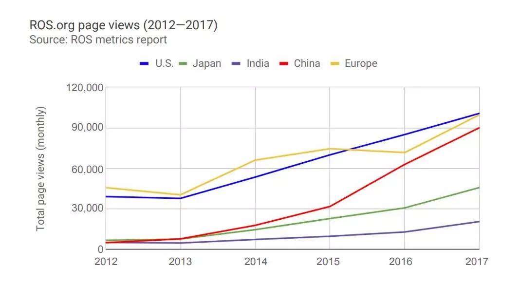 下图显示了自2012年以来全球访问ROS.org最多的五大地区。美国和欧洲的访问次数位居前两位,中国的增长速度位居第一,目前访问次数距离前两名已经不远。2017年,来自中国的访问次数已经相当于2012年的18倍。ROS.org表示,来自中国的访问量增长是结构性的,而不是在中国增加市场营销和资源投入的结果。
