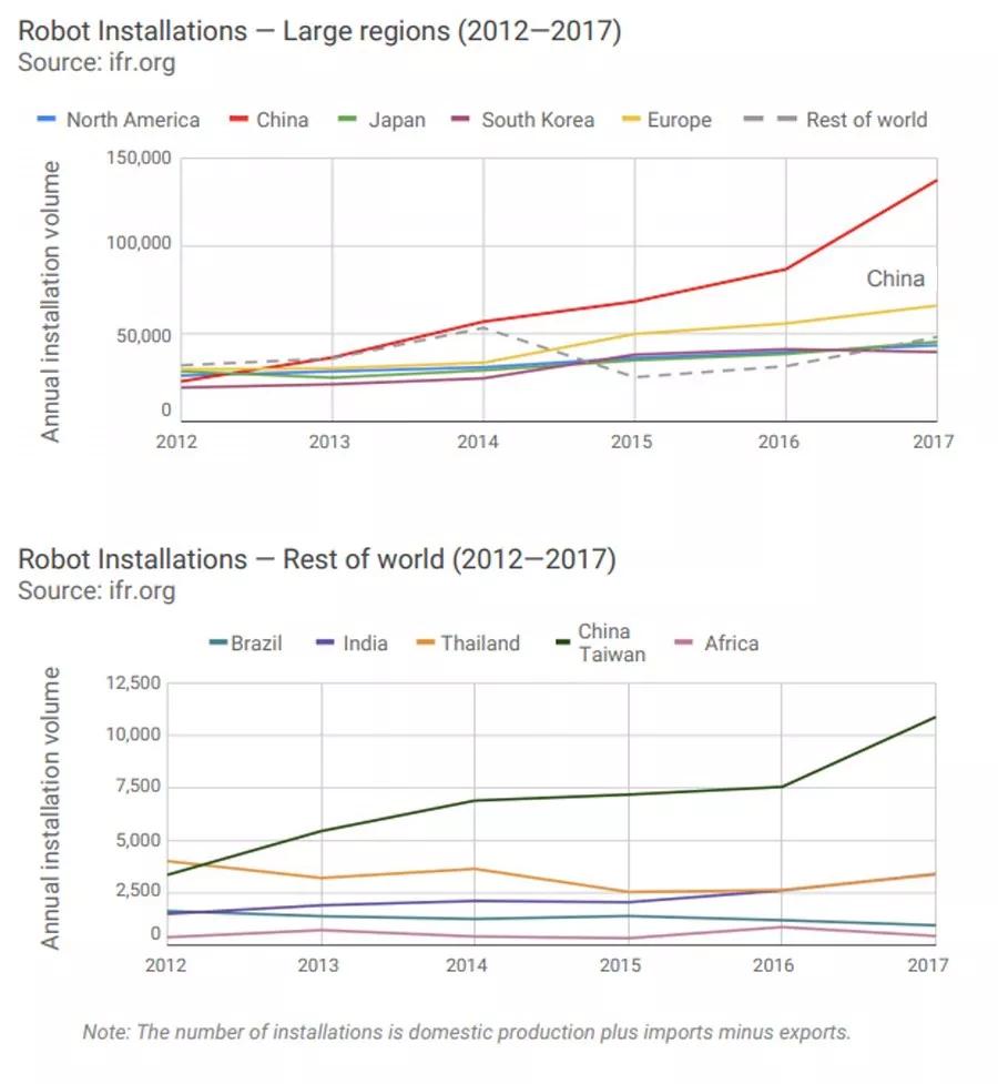 自2012年以来,中国每年的机器人安装量增长了500%,而韩国和欧洲分别增长了105%和122%。