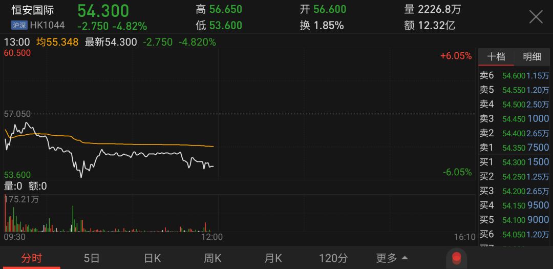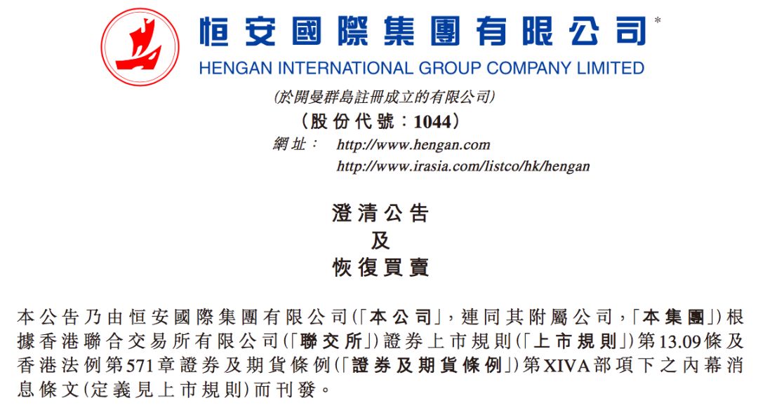 发布澄清公告的同时,恒安国际宣布今天恢复股票交易。今天上午,恒安国际股价再次下跌了4.82%。