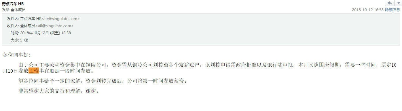 近日,投中网报道称,奇点汽车的员工在今年10月的时候收到了一封来自HR的邮件,内容是宣布公司资金在其他账户,薪酬缓发。自此以后,奇点汽车开启了漫长的三个月欠薪旅程。