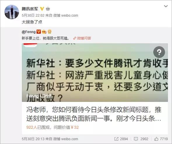 腾讯张军还回答了用户关于“今日头条修改新闻标题”的提问,并做出“太猴急了点”的回答。