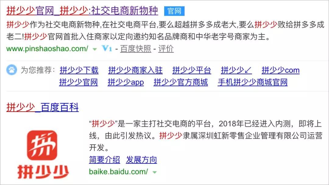 不过,虽然拼少少没有官方 App,但是有官方认证的官网,甚至还有百度百科。slogan 也挺吸引人:社交电商新物种。