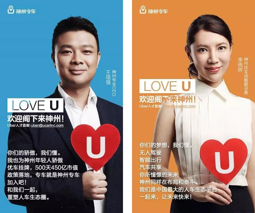 然而,这次被网友称为“脑残”营销的事件在 2016 年又再次上演,滴滴合并 Uber 时,神州专车又策划了主题为“ Love U !欢迎阁下来神州!”的营销。
