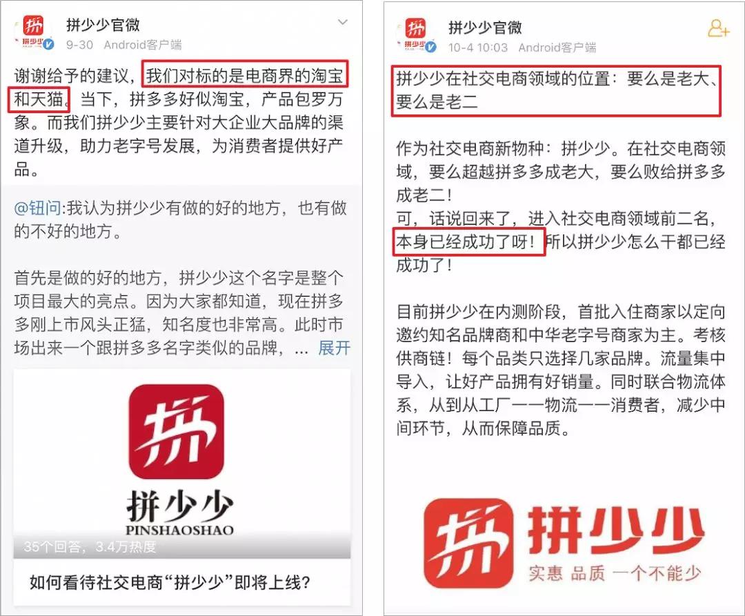 但是,拼少少却有非比寻常的野心,在微博上一会儿声称自己对标电商界的淘宝和天猫,一会儿又说自己在社交电商领域的位置,要么是老大、要么是老二,并大言不惭自己已经成功了。