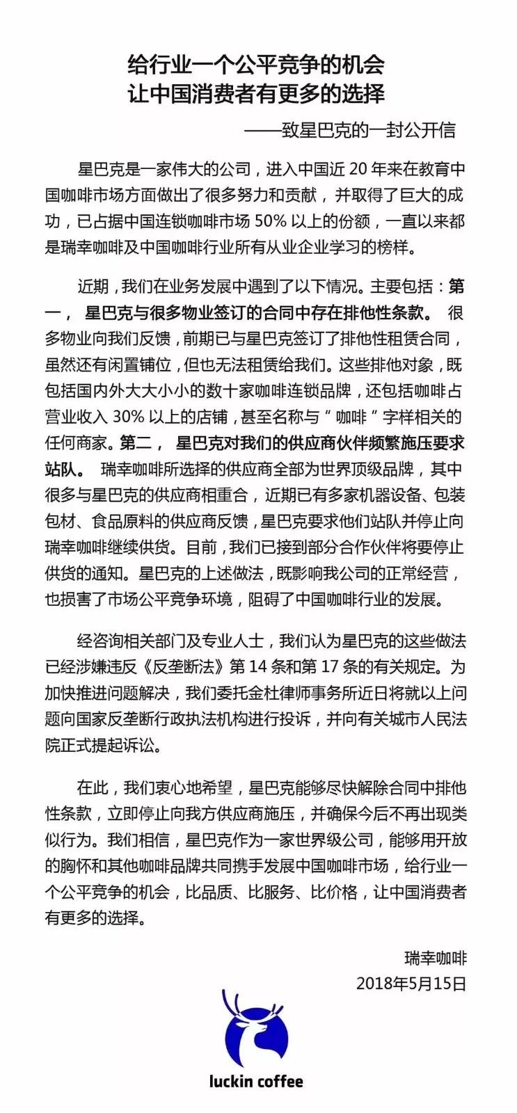 今年 5 月 15 日,瑞幸咖啡向星巴克发了一封公开信。