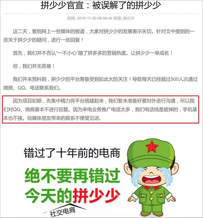 拼少少承认了自己是“一不小心”蹭了拼多多的营销热度,但是他们并无恶意,他们没想到自己获得了如此大的关注,但是因为人手不够,没精力回复外界沟通,所以把电话线拔掉了,手机也不会接。