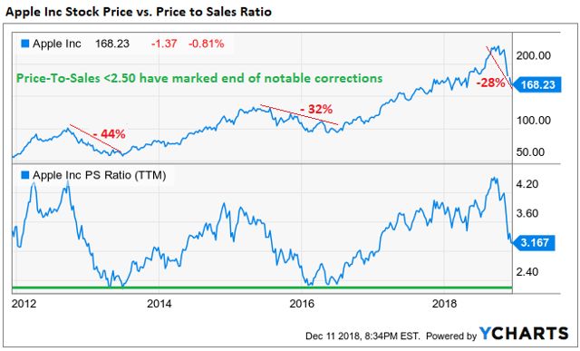 换句话来说,当前苹果的股价为169.1美元,按照12的市盈率来计算的话,苹果的股价将会跌到142.59美元,也就是说,苹果至少还有8%的下跌空间。不过这中间还存在变数,苹果股价自第二次重大修正到今年10月之前,股价连续三年上涨,尤其是今年9月市值历史性的突破万亿美元,而这很大程度上得益于服务业务的增长,服务是相比硬件更稳定的收入,这也让苹果的收入变得更加多元化,苹果理应享受更高的市盈率。