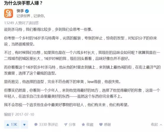土味真的就等于低俗、脑残?快手在知乎上有一段很有代表性的回答,大意是:都市人眼中怪诞,不过是在乡村环境中长大的青少年天然的审美。