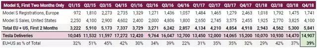 为应对以上问题,下表只列出前两个月的预测数据,按照上季度前两月美国及欧洲销售占总Model S销售的比例37%进行计算,那么预计Q4将交付约14907辆Model S。