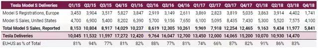 再结合公司各季度的实际交付数据,笔者的预计如下,可以看到过去一年欧洲及美国销售占Model S总销售的85%左右,其余订单在亚太及加拿大。