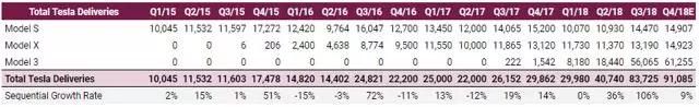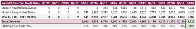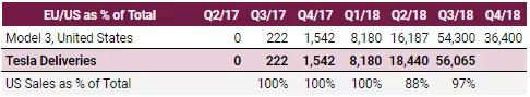 官方并未给出Q4交付预期,从17年Q4到18年Q3交付预期都为10万辆,实际交付情况如下,当前Q4达到10万辆有一定空间。不过,以上预计并未包括中国地区销售,Q4可能出现下滑的情况,官方已出面否定下滑70%的传闻,即便下滑如此,美国及欧洲的销售占比更高,具体影响1月揭晓。