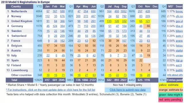 其次,参考Tesla Motors Club给出的欧洲机车注册数据,显示公司各国销售数据。最近一个月数据不全,缺西班牙Model S的登记数据。