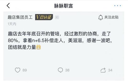 近日,还有趣店认证员工在脉脉发贴称:趣店去年底招聘的管培生,经过激烈协商,走了80%,拿着“N+6.5”补偿走人。