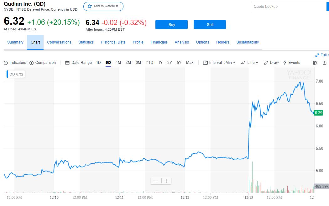 股权回购公告后,在美上市中概股趣店盘前大涨25.48%,报6.60美元,创近3个月来新高。美东时间13日周四,趣店美股高开将近20%,盘中一度升破7美元、日内涨幅约34%,创今年8月24日以来新高,最终收涨20.15%,收报6.32美元,收创8月29日以来新高。