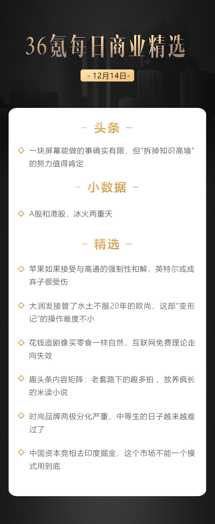 本文来自36氪付费栏目《36氪每日商业精选》——12月14日