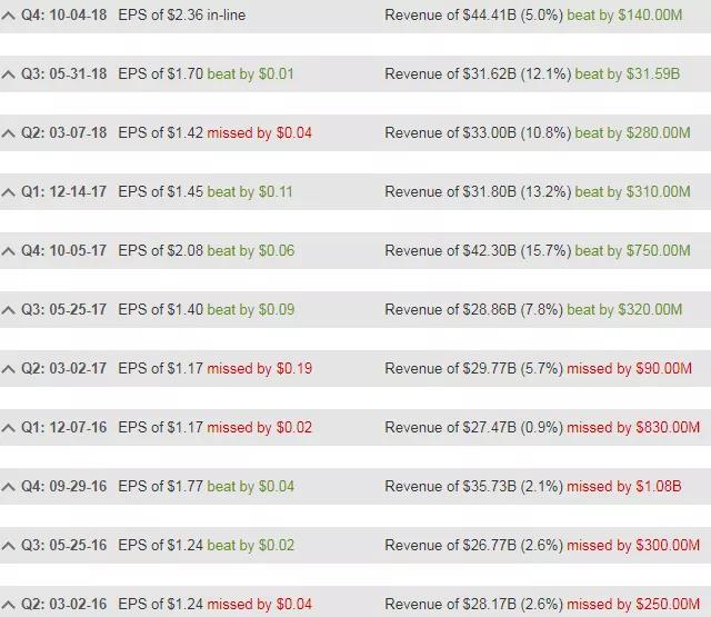 350.7亿美元,同比增长10.3%,比分析师预期高出2.8亿美元,差额可观,从14财年开始到17财年Q2营收持续不及预期,但之后季度均超预期。