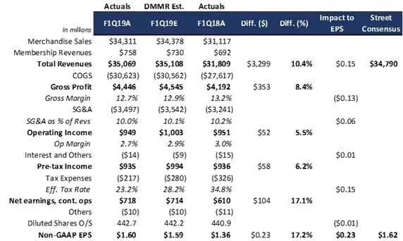 著名仓储超市好市多(COST)美股周四盘后发布19财年Q1财报,季度营收EPS双超预期,而且核心同店可比销售数据强劲,下文对业绩作简要分析。